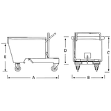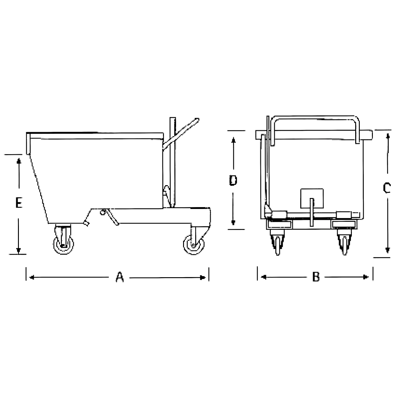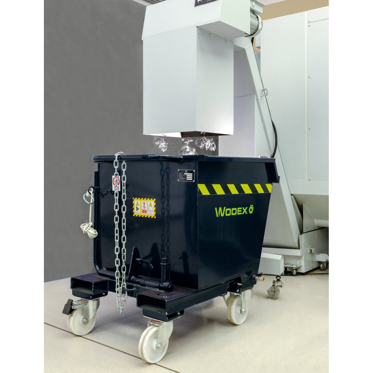 Suporturi autobasculante pentru deșeuri WODEX WX9900. Structură montată pe furcă cu stivuitor; golire automată simplă și sigură a containerului prin pârghia de înclinare, fără a coborî din stivuitor.