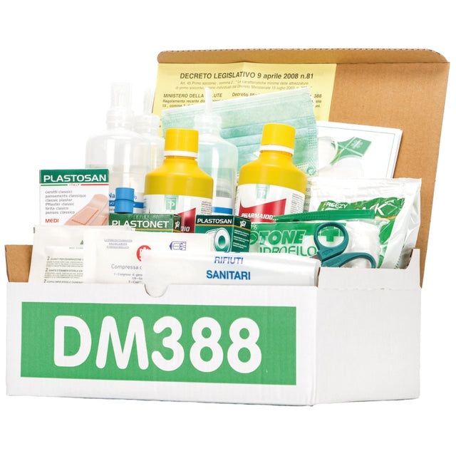 Trusă de prim ajutor STANDARD FÄ‚RÄ‚ SPHYGMOMANOMETRU, conformă cu ANEXA 1 a decretului ministerial italian 388. Dispozitivele medicale sunt conforme cu directiva 93/42 CE, cu decretul legislativ 24.2.97 și cu directiva 2007/47/CEE.