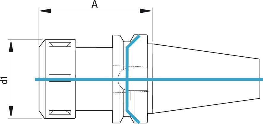 Mandrina pentru bucse elastice OZ Oțel aliat de cementare, rezistență la tracțiune 950 N/mm² Călit HRC 58 ±2, adâncimea de călire min. 0,5 mm Toleranță unghi conic AT3 Concentricitate < 0,01 mm Echilibrat G6.3 / 15.000 min-1 ISO 7388-2 (JIS B 6339 MAS/BT) Forma AD/B Răcire internă