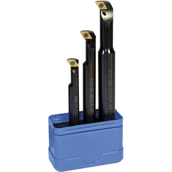 Set cutite pentru strunjire ISO 107.5°, SDQCR/L 07, 3 bucati Pentru placute amovibile 7° pozitiv Cu sistem de insurubare Cu racire interioara Toleranta coada dg7 Pentru strunjire interioara Livrare: Fara placute amovibile, fara surubelnita.